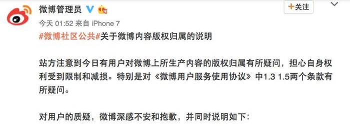 对于这条存在已久的《协议》所引发的争议,9月16日凌晨1点50分,微博官方通过账号@微博管理员 发布了一份公告表示:对用户的质疑,微博深感不安和抱歉。