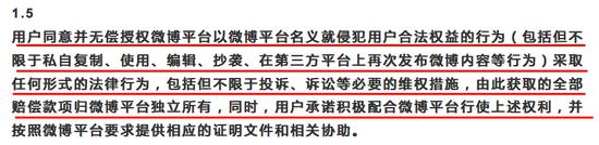 1.5 用户同意并授权微博平台以微博平台名义就侵犯用户合法权益的行为(包括但不限于私自复制、使用、编辑、抄袭、在第三方平台上再次发布微博内容等行为)采取任何形式的法律行为,包括但不限于投诉、诉讼等必要的维权措施。