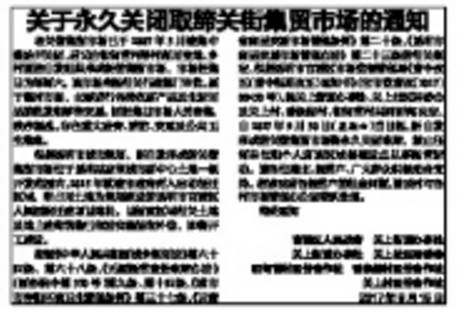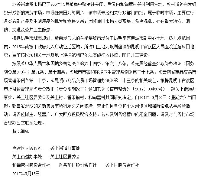 通知上写着:自2017年9月30日(星期六)当日起,新自发形成的关街集贸市场将永久关闭取缔!