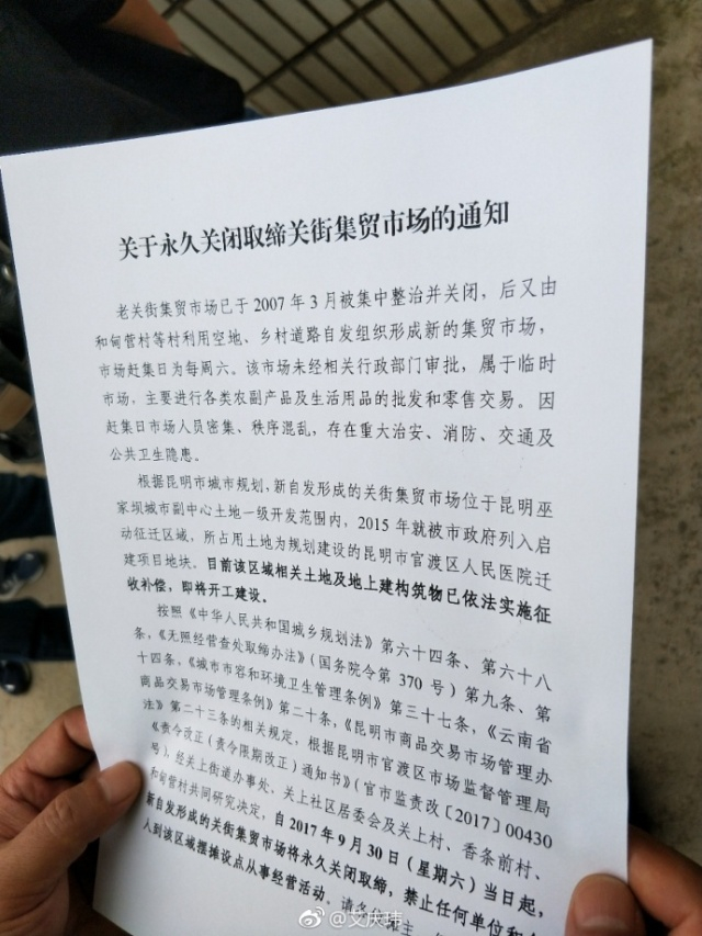 而这一次,关街要彻底取缔了,根据那纸通知的内容:根据昆明市城市规划,新自发形成的关街集贸市场位于昆明巫家坝城市副中心土地一级开发范围内,这块地2015年就被市政府列入启动征迁区域,所占用土地为规划建设的昆明市官渡区人民医院迁建项目地块。目前该区域相关土地及地上建筑物已依法实施征收补偿,即将开工建设……