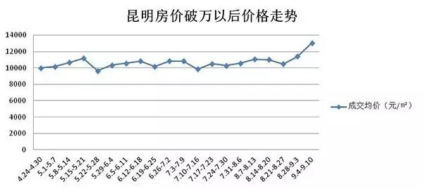 如果按照周成交均价梳理历史数据发现,昆明房价自今年4月最后一个周跨过万元大关之后,迄今已经有18周的房价处于万元以上。其中,房价在10000-11000元/平米的水平上保持了13个周,上下只有几百元的波动幅度,有4个周的房价超过11000元,在这个水平线上,最高为11415元/平米。上周则直接跳涨1600多元至13048,如此高的跳涨幅度在昆明房价破万以来还是首次。