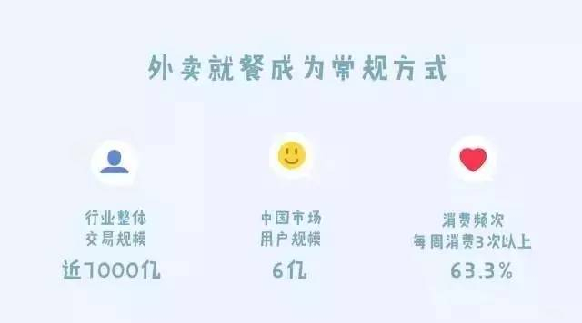 外卖类APP“饿了么”近期也发布了中国外卖大数据,显示中国市场用户规模达到6亿, 2016年在线外卖用户消费频次每周消费3次以上的用户占比高达63.3%,外卖就餐成为常规方式。