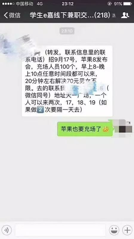 有人在网上质疑,这些排队的是不是全是正宗“果粉”?一张群名为“学生E嘉线下兼职交流群”的聊天截屏显示,“招9月17日,苹果8发布会,充场人员100个。地址天一广场。”