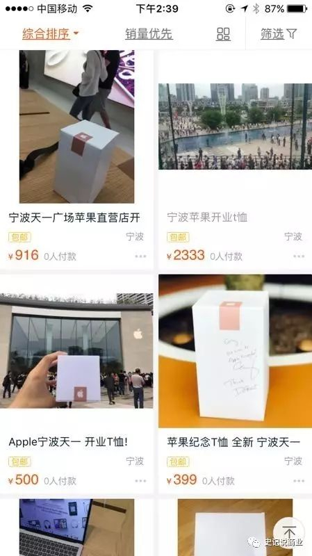 在阿里旗下二手平台“闲鱼”上,由于是新开门店,记者看到Apple Store天一广场店的纪念T恤最高已经被炒到2333元每件。其他城市的AppleStore纪念T恤售价大多在200元每件。