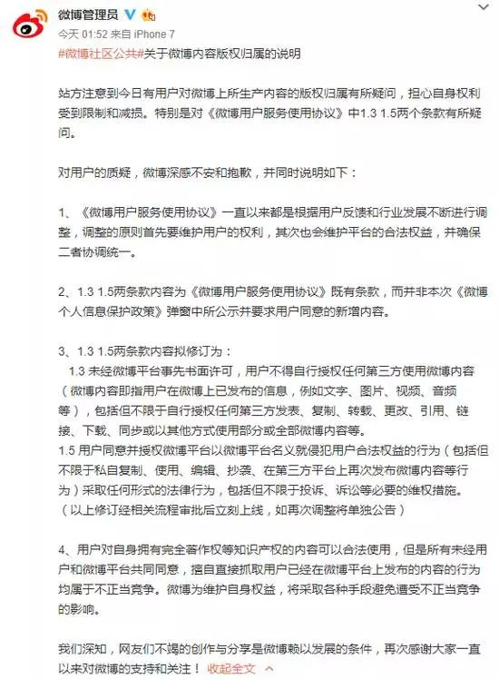 昨天凌晨两点左右,新浪微博方面发布了一份情况说明,其中称:引发舆论关注的两个条款,之前就有,并不是新增的条款;对引起争议的两个条款进行一些修订。声明中重申,用户对自身拥有完全著作权等知识产权的内容可以合法使用,但是所有未经用户和微博平台共同同意,擅自直接抓取用户已经在微博平台上发布的内容的行为均属于不正当竞争。