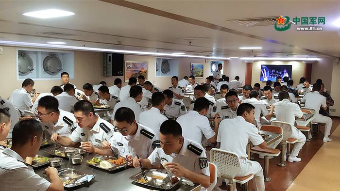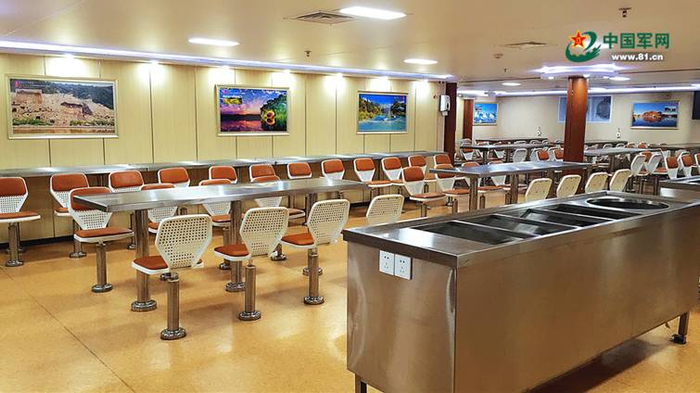 现代化的戚继光舰设有主厨房、配餐间、餐厅等18个舱室,具备350人同时就餐的能力。其中,学员餐厅可以容纳200名学员就餐,这一次参加远航任务的370名海军院校学员就分成两批用餐,清一色自助餐。学员餐厅里还配有四台电视和广播设备,学员们可一边用餐一边通过广播电视获取资讯。