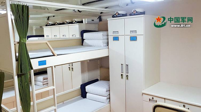 再看戚继光舰的住舱,有没有很像大学宿舍?102个住舱,可保障552人居住。舱内通透明亮,书桌、衣柜、电话、水杯架等设施一应俱全,而且考虑到航行期间船体摇晃的情况,全部设置了固定配件。戚继光舰的每个房间都装有中央空调,可随时调节室内温度。除了绝大多数的学员八人间、学员六人间外,还有少数提供给随舰教员住宿的四人间、双人间、单人间,这类房间里配有独立卫生间可供洗浴,还有数字电视可供观看。不仅如此,住舱床铺的设计还考虑到了官兵的隐私保护,为每一个床铺安置了小拉帘和床头灯,更具人性化。