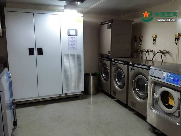 通常,海军在执行远海航行任务期间,舰员和实习学员在船上的着装基本就三样:海军作训服(人们常说的迷彩服)、常服(帅气逼人、衬托颜值的白色和藏青色制式服装)以及体能训练服(海魂衫)。尤其是白色的常服,穿在身上吸睛力十足,不过,清洗的频率与它的魅力也成正比。洗衣量这么大再加上漂在海上气候潮湿,洗完的大批衣服速干问题如何解决?拿到甲板上晒?遇到天气不稳定的时候,海风海浪会躲过船绕着走吗?当然不。这时候,船舱里的洗衣房和烘衣房就派上用场了!