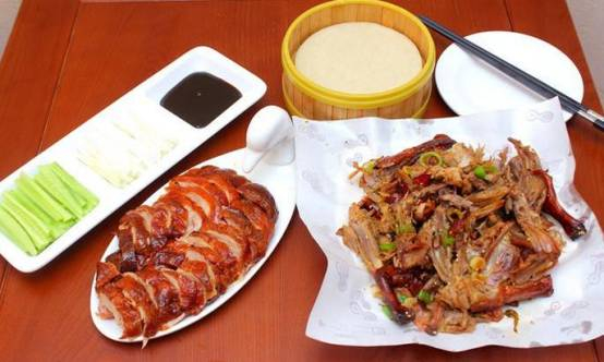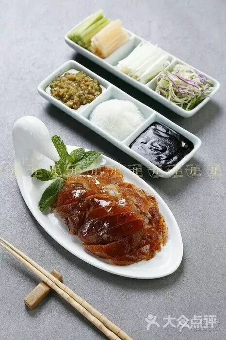 烤鸭外皮焦脆,沾着彩色的蔗糖吃,奇香无比,是最近比较流行的吃法。店家还独创了沾蓝莓果酱的吃法,也是别有一番风味。鸭肉的肉质紧实,但一点都不柴。掀一张饼,把鸭肉、葱丝、甜面酱按照1:1:1的比例卷进去是最正宗的吃法,也可以根据个人口味加入黄瓜条或哈密瓜条,清新解腻。