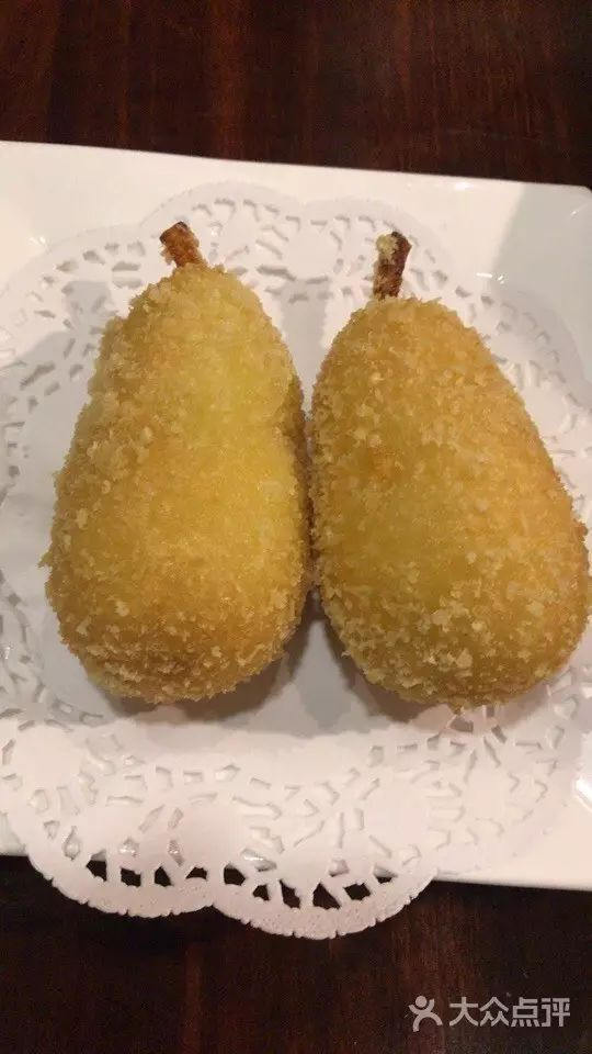 黄金鸭梨:外形胜似金黄色的一颗梨。看着像油炸鸭梨,实则是外面糯米,里面豆沙馅,梨把是胡萝卜做的。炸完神似一个金黄色的梨子,很可爱。