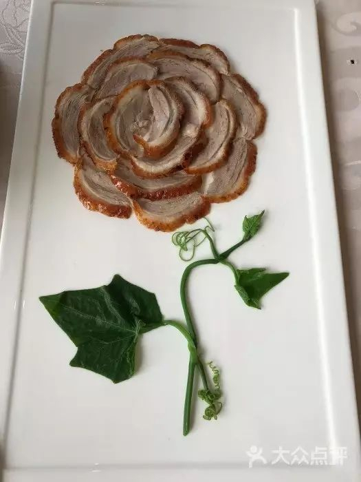 二月二特色烤鸭:明厨亮档,鸭子烤制过程清晰可见。端上桌时半只烤鸭已经片好,摆盘装饰了鲜花和薄荷叶,枣红色的鸭子配上蓝色的花、绿色的叶,卖相非常好看。