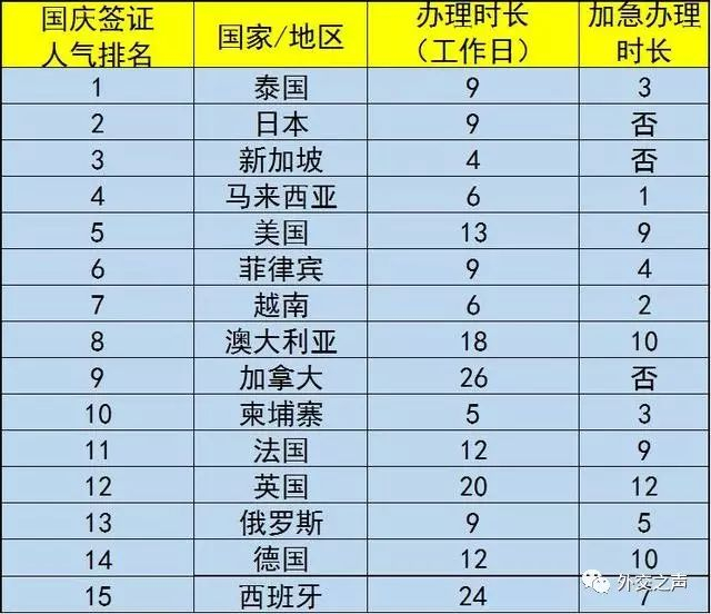 按签证申请办理人数从高到低排名,携程旅游发布“国庆签证热门目的地TOP15”依次是:泰国、日本、新加坡、马来西亚、美国、菲律宾、越南、澳大利亚、加拿大、柬埔寨、法国、英国、俄罗斯、德国、西班牙。