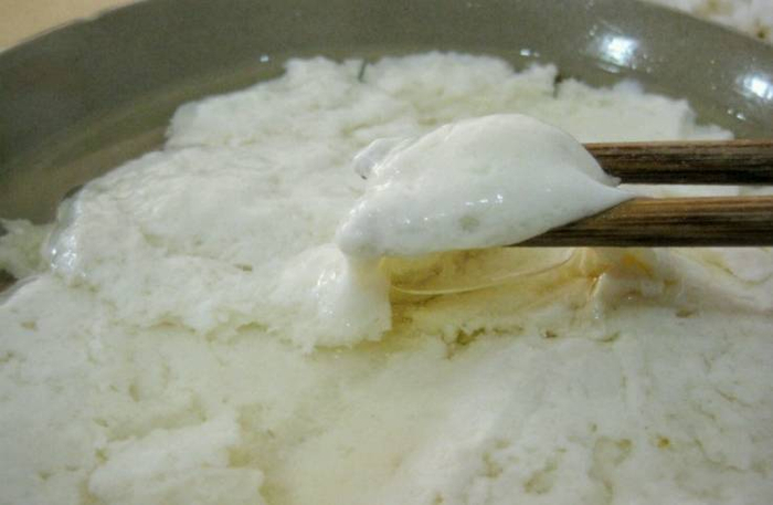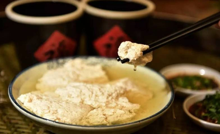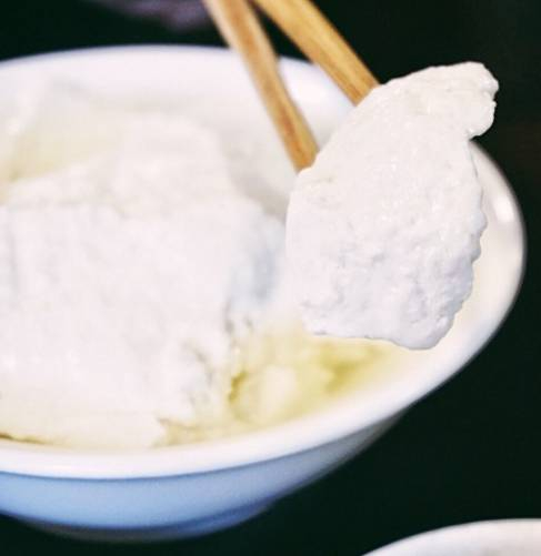 “水上漂”豆花虽然很嫩,但一点不散,它得用筷子把漂在面上的豆花聚到一堆,沥干水后再用筷子压一压。