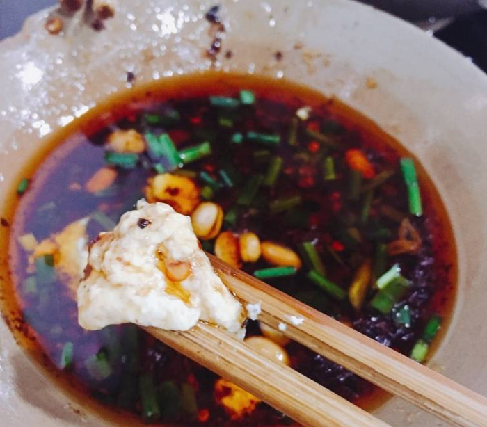 豆花儿一泯就化在嘴里,配上蘸碟的辣味,还有葱香味越吃越香~