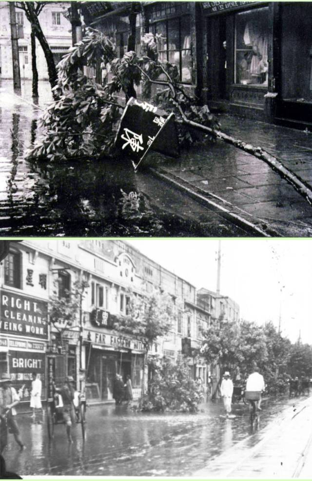 1915年7月27~28日强台风袭沪,极大风速达 43.9米/秒,吹斜徐家汇天主堂尖顶重达 400公斤之铁十字架,房屋坍塌,树木摧折,马路积水盈尺,农田受淹,通信中断,工商业停顿,英法租界行道树被吹倒达6000余株。黄浦江沉船300余艘,损坏船只千艘,浮尸200余具,损失严重。