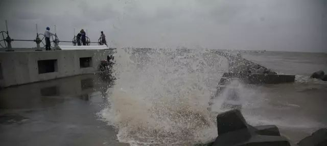 2012年8月8日,上海抗击台风海葵。金山区海塘管理所职工冒着大风大浪关闭阀门