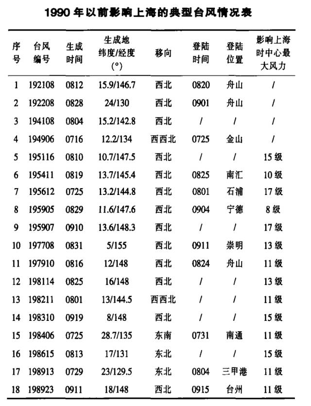 根据徐家汇和龙华气象资料,清光绪元年(1875年)至1990年影响上海的台风共有300次,平均每年2.6次,最多年7次,个别年份没有台风影响。其中,伴有10级以上大风的台风约占总次数的21%,伴有暴雨的台风约占24%。