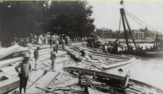 20世纪早期一场台风袭击上海,图为外滩江边被冲上堤岸的各种船只