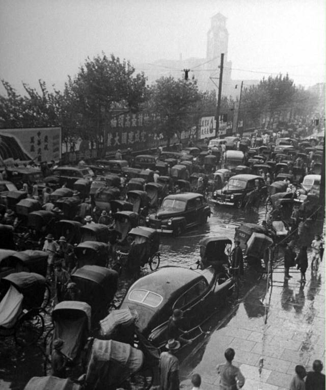 1945年9月14日,台风URSULA(乌苏拉,注:当时国内没有给台风命名的习惯,这是当时美国预报中的命名)过境上海,带来大量降水,致使市区多处内涝。图为市区一条主干道混乱不堪的场景,远处跑马场钟楼隐约可见,从拍摄角度推测为静安寺路也就是现今南京西路靠近西藏路段。