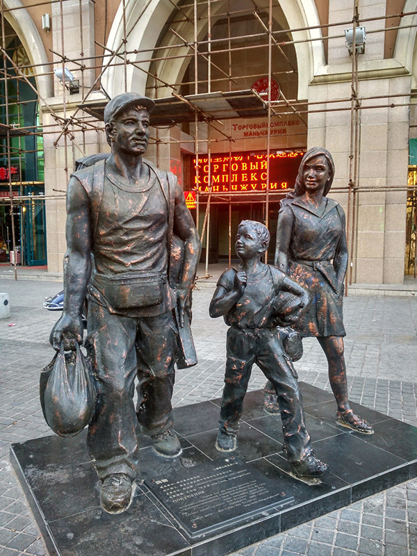 这座大包小包拖儿带女的第三世界工人阶级模样的雕像特别能代表在满洲里的俄人形象。
