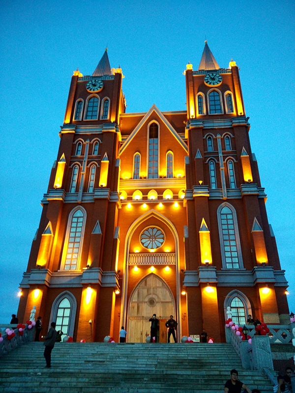 在满洲里市区的最东侧的小山岗是这座城市的最高点,一座教堂模样的建筑屹立在山岗上。这不是一座真的教堂,而是政府为了招徕游客而修建的婚礼场所,当地人称为婚礼宫。每天晚上有很多人去婚礼宫拍夜景,运气好的话能看到烟花表白,倒是很美的一幕。