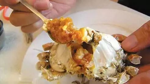 3、先吃蟹盖,用小勺把中间的蟹胃部分舀出,轻轻将外面包裹着的蟹黄吮干净。但要注意别吮破蟹胃,不干净。