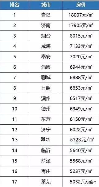 山东省各地市8月份房价排行榜如下:
