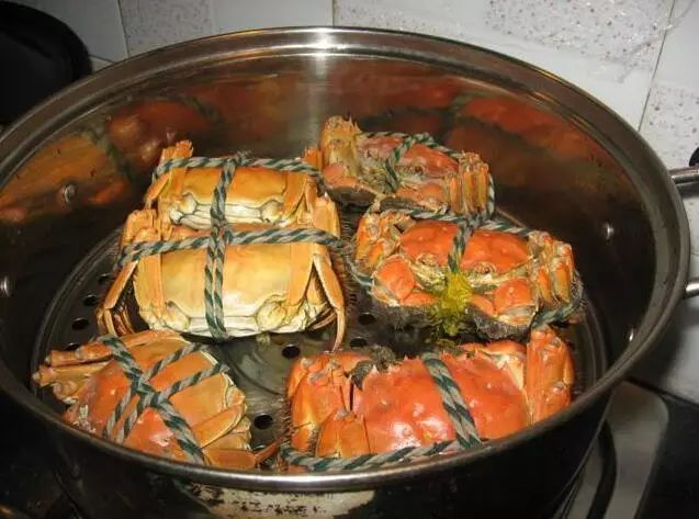首先螃蟹要捆绑着,而且要仰面蒸。
