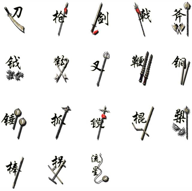 有长器械,短器械。软器械、双器械;有带钩的、带刺的、带尖的、带刀的、有明的、暗的;有攻的、防的;有打的、杀的击的、射的、挡的。 可见,十八般武艺所列兵器,是古代大师的兵器(约有四百多种)中,在实战时最常用的一部分。