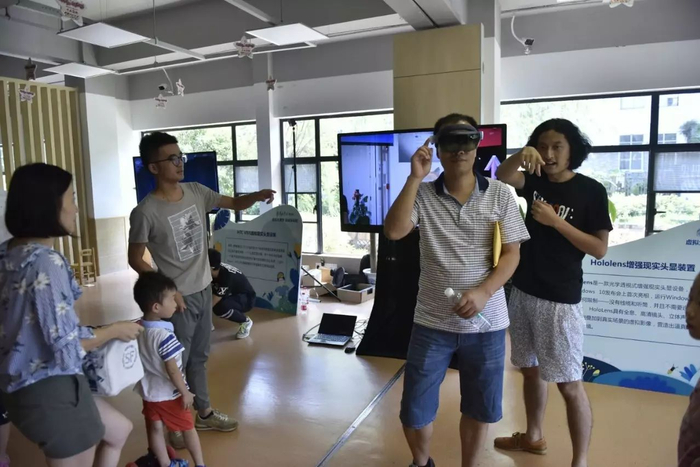 为加深市民对虚拟现实的理解,当天活动不仅设置了互动问答环节,更送出Cardboard3D眼镜,让参与其中的家庭观众们可以把体验带回家。活动现场还划出了全息投影DIY互动课堂以及虚拟现实互动体验区。其中,DIY互动课堂由广东工业大学机电学院助理研究员吴悦明老师负责,带领现场大小学生自己动手做一个立体全息投影装置。而互动区内,研究室和拥有VR教育云平台的广州市新芯信息科技股份有限公司,分别带来HTC VIVE、Kinect、Hololens等热门的虚拟现实设备体验。