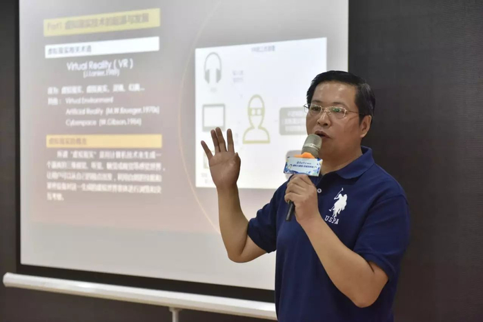 活动中,何教授首先深入浅出的给大家介绍了VR、AR、MR与全息投影这几种常听常见的虚拟现实技术以及它们的区别,由此带进“虚拟现实技术发展与应用”的主题讲座。讲座当中,他从虚拟现实的起源与发展说起,深入的讲解了虚拟现实的相关设备与实现原理。