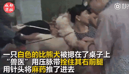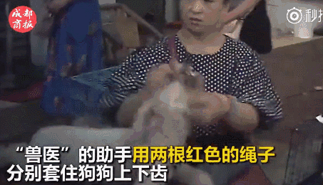一只白色的博美犬被摁在了桌子上,“兽医”用压脉带拴住其右前腿,用针头将麻药推了进去,30秒之后,狗狗渐渐失去了意识,“兽医”的助手用两根红色的绳子,分别套住狗狗上下齿,然后用力往不同的方向拉伸,狗狗瞬间被拉成了一副张牙裂齿的模样,面目狰狞。