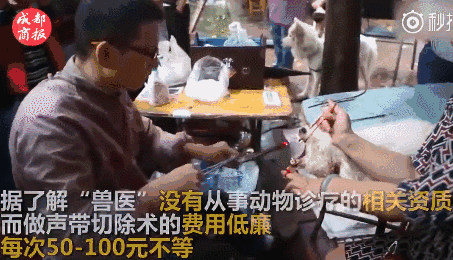近日,在成都青白江花鸟市场内的狗市区域,一位中年男子拉开了一张桌子,当街做起了狗狗声带切除手术,生意颇为火爆。网友将图片上传网络之后,引发不小争议。
