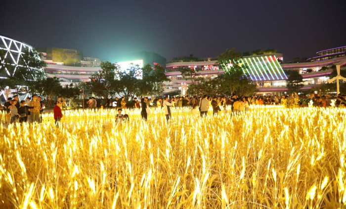 IP展,也是大悦城的强项。从2015年圣诞的“魔兽”开始,成都大悦城一直在引进各种创新、吸睛的IP主题展。伴随每一次的“疯抢节”,IP为吸引客流也起到了巨大的推动作用。本次疯抢节,正值成都大悦城“DREAM FIELD”金色麦田展。大悦城用1500㎡打造了一片璀璨的金色麦田,这片麦田由数千支麦穗组成,除了真正的小麦以外,还有由逼真的淡黄色麦粒灯和麦秆组成的科技小麦。满满的科技感与超高的颜值,吸引大波消费者前来合影留恋。