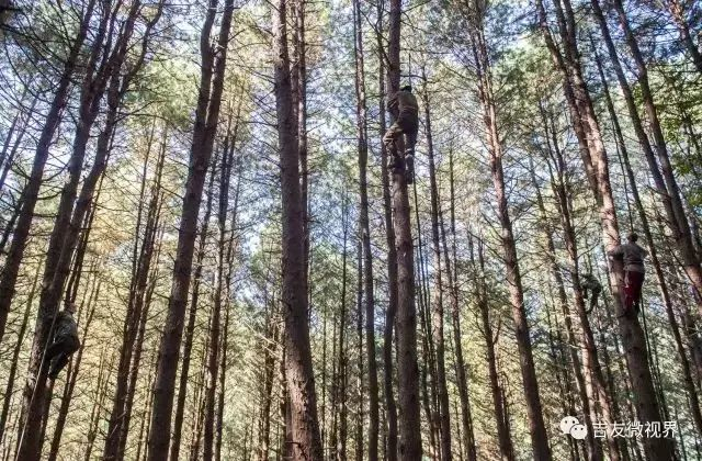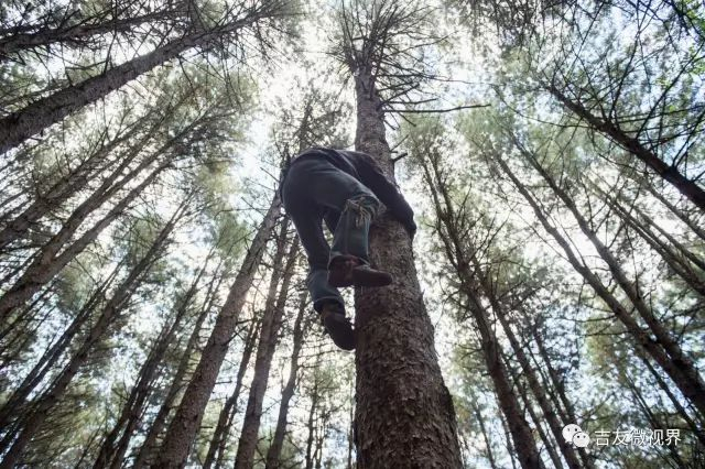 他们靠着绑在腿上的脚扎子,一步一扎向树顶攀爬,每天上上下下要爬近30棵松树。