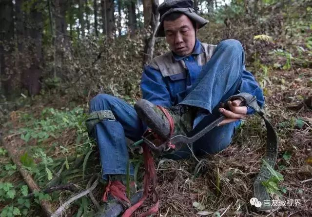 苗锡斌今年58岁,20岁时开始打塔,那时树还很矮,不用穿脚扎子就能上树,随着松树越来越高,他也就学会了穿脚扎子上树。他每天大概上下7棵树就要休息一下,而这些树都有20多米高。
