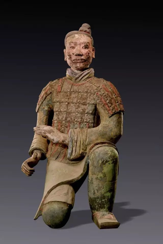 一尊色彩保存较完整的跪射俑足以体现兵马俑服饰的艳丽:身穿粉绿色长袄,外披赭色铠甲,铠甲上缀着朱红色甲带和白色甲丁,下身穿着天蓝色裤子和粉紫色护腿。
