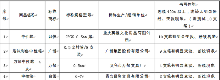 初写性能考核初次书写时笔在一定的划线距离内能否正常出墨。间歇书写主要测试笔在放置24小时后能否正常出墨,由于中性墨水圆珠笔的笔墨相对来说较易挥发,所以标准对中性墨水圆珠笔的间歇书写设置了相应的要求。书写性能主要考核笔的灌墨量多少及笔头与墨水匹配程度等方面,标准要求每个规格型号的样品需测试10支笔,看其在一定划线距离内是否有明显断线、变淡等现象。比较试验结果显示,30件样品的初写性能和21件中性墨水圆珠笔的间歇书写性能均表现良好,有4件样品在书写性能测试过程中存在出墨明显变淡或断线现象(详见下表)。如标称由重庆英雄文化用品有限公司生产的中性笔(标称商标:以恒;标称规格型号:2PCS 0.5mm黑),其10支笔在测试过程中均出现变淡或断线现象。