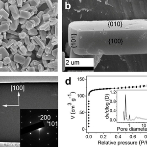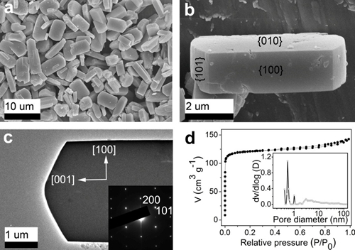 (a)高分散的Si-ZSM-5@GO晶体的SEM图;(b)单个Si-ZSM-5@GO晶体的SEM图;(c)Si-ZSM-5@GO沸石晶体的TEM图和原位电子衍射图,表明晶体沿c轴方向生长;(d)氩气吸脱附曲线和孔径分布图。