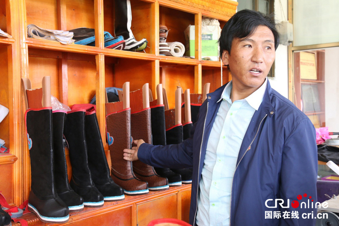 巴桑次仁从15岁开始学习制作藏靴藏服,经过多年的学习积累,成为噶东靴子和藏靴的传承人。现在,他创办的合作社制作一双靴子能卖到600-1000元。摄影:徐艺源