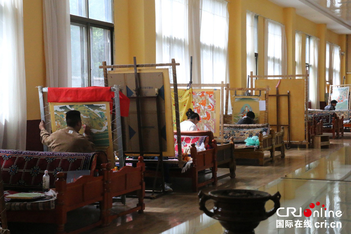在拉萨这家唐卡画院中,每天雷打不动坐在榻上画唐卡的都是年轻人。他们从小学习画唐卡,6-14年不等,才能独立完成画作。摄影:徐艺源