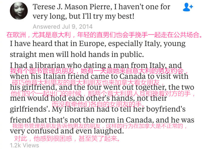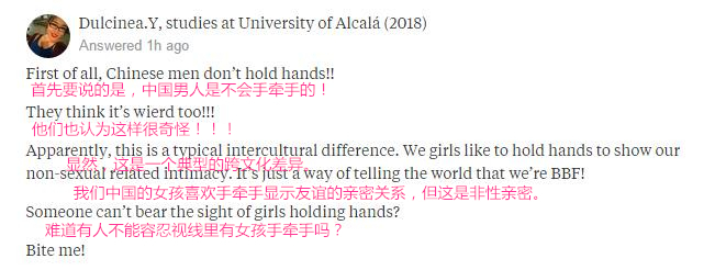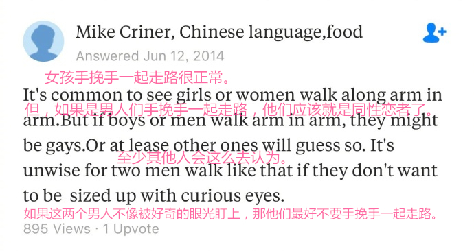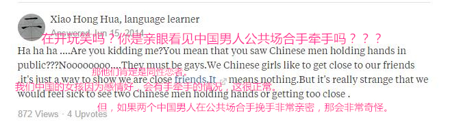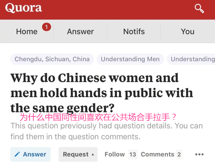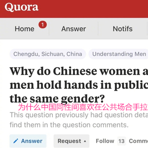对于这个问题,Quora上一片呐喊“中国男人才不会手牵手啊!!!”