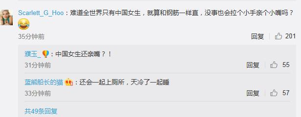 有网友称,中国的女生“没事会拉个小手”,甚至“亲个小嘴”,“天冷了一起睡”,“相约一起上厕所”……但,她们不是同性恋者,是“和钢筋一样直”。
