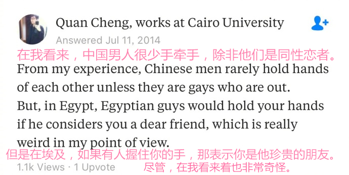 其实,“中国男人间手牵手”不常有,但在Quora各种回帖中,却发现有些国家“男人间牵手”也很普通,比如网友爆料的埃及、意大利。
