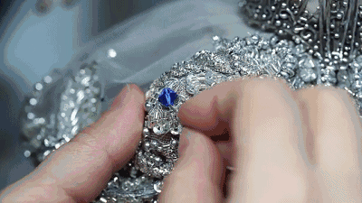 而点缀着蕾丝、绣花,镶嵌着珠宝、亮片的娃娃服饰,需要一针一线地缝制↓↓ 娃娃的华服,完全不亚于巴黎时装周上的高定服装。