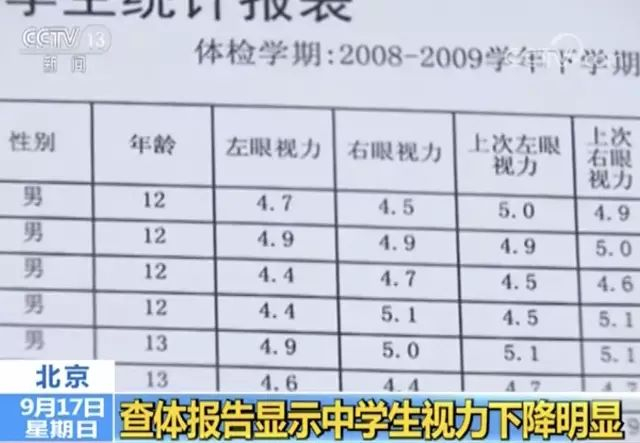 在北京理工大学附中,从历年学生的查体报告可以清晰看到,2008年初一学生的平均视力基本在4.5到5.0,到了2017年,同样初一学生,视力则普遍在4.2到4.7之间。