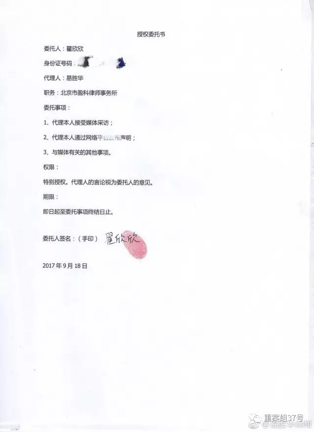 ▲易胜华律师接受翟欣欣委托,代理案件。
