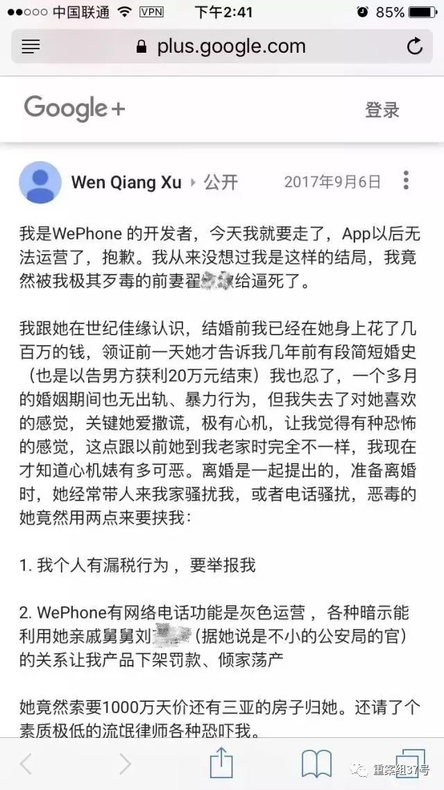 2017年9月6日,WePhone的创始人兼开发者苏享茂在Google+留下一份网贴,称在婚恋网站遇到翟某某并遭遇离婚后,前妻向他索要1000万人民币和一套房产。由于自己没有1000万又走投无路,将要因此离开人世,并在相册中留下与前妻的对话截图。