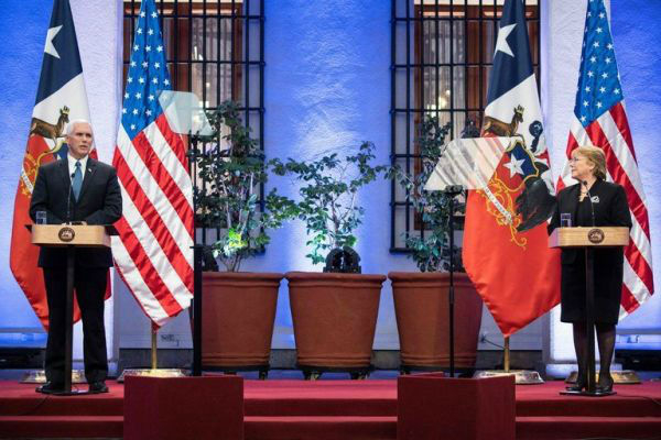 8月16日,智利首都圣地亚哥,美国副总统彭斯(左)和智利总统巴切莱特会晤后共同举行新闻发布会。