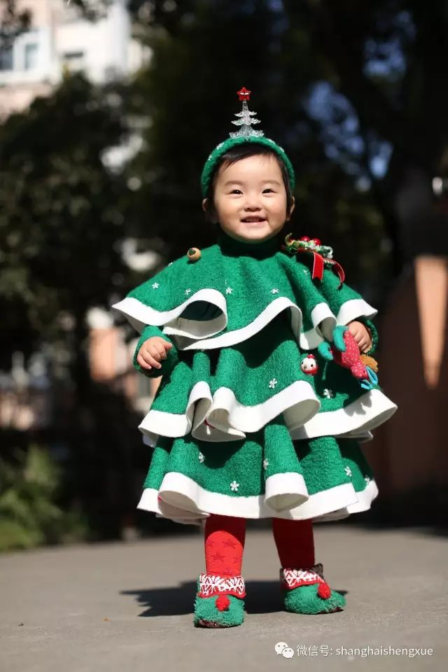 这一套叫“移动的圣诞树”,衣服上的小花朵全靠手工一颗一颗钉上去,花了整整两个晚上。